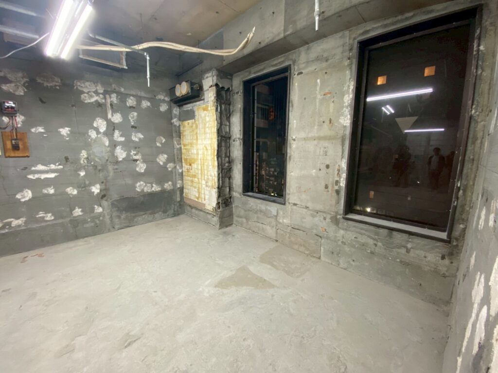 コンクリートの壁や天井がむき出しの状態。設備や配線も撤去されているため、自由にレイアウトを設計できます。