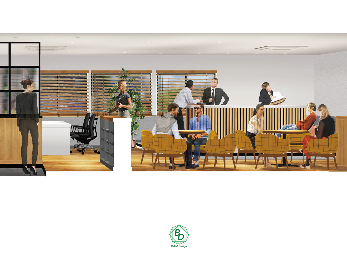 本事例は、当社デザイン設計部が作成した建築パースをもとに計画・施工を行ったオフィス内装事例です。