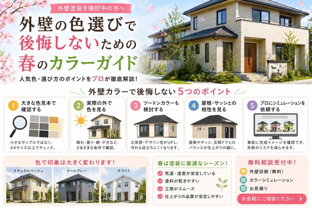 そこで今回は、春におすすめの外壁カラーと後悔しないための選び方について、プロ目線で詳しく解説します。